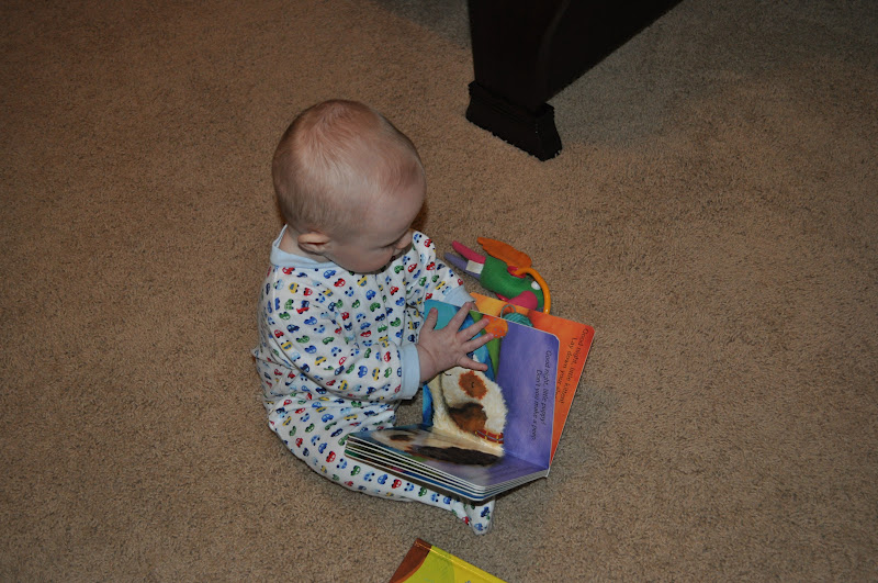Sitting up- Yep January 31st he sat up for the first time on his own. What a big boy he is now. He is such a cute little petite thing it is so cute to see him sitting up all by himself. He had his six month appointment and was in the 25th percentile for height, weight, and head circumference. Dr. Pickens said that is just fine and that he is growing as should be.